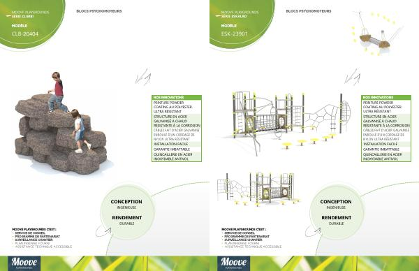 MODÈLE BLOCS PSYCHOMOTEURS MOOVE PLAYGROUNDS C ’ EST : • SERVICE DE CONSEIL • PROGRAMME DE PARTENARIAT • SURVEILLANCE CHANTIER NOS INNOVATIONS CÂBLES NYLON ULTRA RÉSISTANT DE D ' UN CORDAGE ENROULÉ D ' ACIER GALVANISÉ FAIT PEINTURE ULTRA RÉSISTANT COATING AU POLYESTER POWDER QUINCAILLERIE ANTIVOL INOXYDABLE EN ACIER • PLAN INGÉNISÉ FOURNI • ASSISTANCE TECHNIQUE ACCESSIBLE MOOVE PLAYGROUNDS CLIMB ! SÉRIE STRUCTURE À LA CORROSION RÉSISTANTE À CHAUD GALVANISÉ EN ACIER GARANTIE IMBATTABLE INSTALLATION FACILE CONCEPTION RENDEMENT DURABLE INGÉNIEUSE !!"# 20404