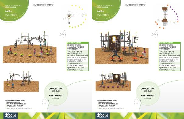 MODÈLE BLOCS PSYCHOMOTEURS MOOVE PLAYGROUNDS C ’ EST : • SERVICE DE CONSEIL • PROGRAMME DE PARTENARIAT • SURVEILLANCE CHANTIER NOS INNOVATIONS CÂBLES NYLON ULTRA RÉSISTANT DE D ' UN CORDAGE ENROULÉ D ' ACIER GALVANISÉ FAIT PEINTURE ULTRA RÉSISTANT COATING AU POLYESTER POWDER QUINCAILLERIE ANTIVOL INOXYDABLE EN ACIER • PLAN INGÉNISÉ FOURNI • ASSISTANCE TECHNIQUE ACCESSIBLE MOOVE PLAYGROUNDS ESKALAD SÉRIE STRUCTURE À LA CORROSION RÉSISTANTE À CHAUD GALVANISÉ EN ACIER GARANTIE IMBATTABLE INSTALLATION FACILE CONCEPTION RENDEMENT DURABLE INGÉNIEUSE !"#$% 93 &%