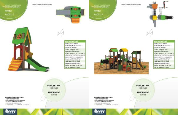MODÈLE BLOCS PSYCHOMOTEURS MOOVE PLAYGROUNDS C ’ EST : • SERVICE DE CONSEIL • PROGRAMME DE PARTENARIAT • SURVEILLANCE CHANTIER NOS INNOVATIONS CÂBLES NYLON ULTRA RÉSISTANT DE D ' UN CORDAGE ENROULÉ D ' ACIER GALVANISÉ FAIT PEINTURE ULTRA RÉSISTANT COATING AU POLYESTER POWDER QUINCAILLERIE ANTIVOL INOXYDABLE EN ACIER • PLAN INGÉNISÉ FOURNI • ASSISTANCE TECHNIQUE ACCESSIBLE FA002-3 MOOVE PLAYGROUNDS FANTASTIQUE ! SÉRIE STRUCTURE À LA CORROSION RÉSISTANTE À CHAUD GALVANISÉ EN ACIER GARANTIE IMBATTABLE INSTALLATION FACILE CONCEPTION RENDEMENT DURABLE INGÉNIEUSE