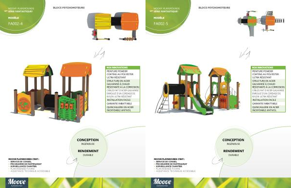 MODÈLE BLOCS PSYCHOMOTEURS MOOVE PLAYGROUNDS C ’ EST : • SERVICE DE CONSEIL • PROGRAMME DE PARTENARIAT • SURVEILLANCE CHANTIER NOS INNOVATIONS CÂBLES NYLON ULTRA RÉSISTANT DE D ' UN CORDAGE ENROULÉ D ' ACIER GALVANISÉ FAIT PEINTURE ULTRA RÉSISTANT COATING AU POLYESTER POWDER QUINCAILLERIE ANTIVOL INOXYDABLE EN ACIER • PLAN INGÉNISÉ FOURNI • ASSISTANCE TECHNIQUE ACCESSIBLE FA002-5 MOOVE PLAYGROUNDS FANTASTIQUE ! SÉRIE STRUCTURE À LA CORROSION RÉSISTANTE À CHAUD GALVANISÉ EN ACIER GARANTIE IMBATTABLE INSTALLATION FACILE CONCEPTION RENDEMENT DURABLE INGÉNIEUSE