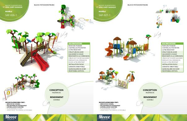 MODÈLE BLOCS PSYCHOMOTEURS MOOVE PLAYGROUNDS C ’ EST : • SERVICE DE CONSEIL • PROGRAMME DE PARTENARIAT • SURVEILLANCE CHANTIER NOS INNOVATIONS CÂBLES NYLON ULTRA RÉSISTANT DE D ' UN CORDAGE ENROULÉ D ' ACIER GALVANISÉ FAIT PEINTURE ULTRA RÉSISTANT COATING AU POLYESTER POWDER QUINCAILLERIE ANTIVOL INOXYDABLE EN ACIER • PLAN INGÉNISÉ FOURNI • ASSISTANCE TECHNIQUE ACCESSIBLE SAF-027-1 MOOVE PLAYGROUNDS FORÊT SÉRIE MAGIQUE STRUCTURE À LA CORROSION RÉSISTANTE À CHAUD GALVANISÉ EN ACIER GARANTIE IMBATTABLE INSTALLATION FACILE CONCEPTION RENDEMENT DURABLE INGÉNIEUSE