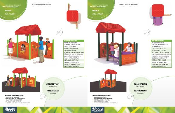 MODÈLE BLOCS PSYCHOMOTEURS MOOVE PLAYGROUNDS C ’ EST : • SERVICE DE CONSEIL • PROGRAMME DE PARTENARIAT • SURVEILLANCE CHANTIER NOS INNOVATIONS CÂBLES NYLON ULTRA RÉSISTANT DE D ' UN CORDAGE ENROULÉ D ' ACIER GALVANISÉ FAIT PEINTURE ULTRA RÉSISTANT COATING AU POLYESTER POWDER QUINCAILLERIE ANTIVOL INOXYDABLE EN ACIER • PLAN INGÉNISÉ FOURNI • ASSISTANCE TECHNIQUE ACCESSIBLE STRUCTURE À LA CORROSION RÉSISTANTE À CHAUD GALVANISÉ EN ACIER GARANTIE IMBATTABLE INSTALLATION FACILE CONCEPTION RENDEMENT DURABLE INGÉNIEUSE MOOVE PLAYGROUNDS SÉRIE DÉCOUVERTE SD ! 13901