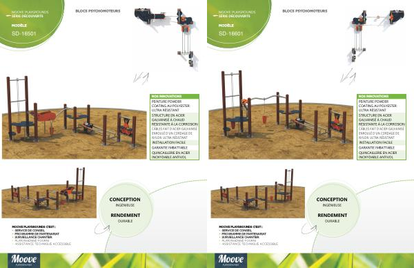 MODÈLE BLOCS PSYCHOMOTEURS MOOVE PLAYGROUNDS C ’ EST : • SERVICE DE CONSEIL • PROGRAMME DE PARTENARIAT • SURVEILLANCE CHANTIER NOS INNOVATIONS CÂBLES NYLON ULTRA RÉSISTANT DE D ' UN CORDAGE ENROULÉ D ' ACIER GALVANISÉ FAIT PEINTURE ULTRA RÉSISTANT COATING AU POLYESTER POWDER QUINCAILLERIE ANTIVOL INOXYDABLE EN ACIER • PLAN INGÉNISÉ FOURNI • ASSISTANCE TECHNIQUE ACCESSIBLE STRUCTURE À LA CORROSION RÉSISTANTE À CHAUD GALVANISÉ EN ACIER GARANTIE IMBATTABLE INSTALLATION FACILE CONCEPTION RENDEMENT DURABLE INGÉNIEUSE MOOVE PLAYGROUNDS SÉRIE DÉCOUVERTE SD ! 16501