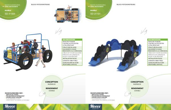MODÈLE BLOCS PSYCHOMOTEURS MOOVE PLAYGROUNDS C ’ EST : • SERVICE DE CONSEIL • PROGRAMME DE PARTENARIAT • SURVEILLANCE CHANTIER NOS INNOVATIONS CÂBLES NYLON ULTRA RÉSISTANT DE D ' UN CORDAGE ENROULÉ D ' ACIER GALVANISÉ FAIT PEINTURE ULTRA RÉSISTANT COATING AU POLYESTER POWDER QUINCAILLERIE ANTIVOL INOXYDABLE EN ACIER • PLAN INGÉNISÉ FOURNI • ASSISTANCE TECHNIQUE ACCESSIBLE STRUCTURE À LA CORROSION RÉSISTANTE À CHAUD GALVANISÉ EN ACIER GARANTIE IMBATTABLE INSTALLATION FACILE CONCEPTION RENDEMENT DURABLE INGÉNIEUSE MOOVE PLAYGROUNDS SÉRIE DÉCOUVERTE SD ! 21101