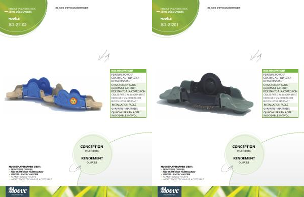 MODÈLE BLOCS PSYCHOMOTEURS MOOVE PLAYGROUNDS C ’ EST : • SERVICE DE CONSEIL • PROGRAMME DE PARTENARIAT • SURVEILLANCE CHANTIER NOS INNOVATIONS CÂBLES NYLON ULTRA RÉSISTANT DE D ' UN CORDAGE ENROULÉ D ' ACIER GALVANISÉ FAIT PEINTURE ULTRA RÉSISTANT COATING AU POLYESTER POWDER QUINCAILLERIE ANTIVOL INOXYDABLE EN ACIER • PLAN INGÉNISÉ FOURNI • ASSISTANCE TECHNIQUE ACCESSIBLE STRUCTURE À LA CORROSION RÉSISTANTE À CHAUD GALVANISÉ EN ACIER GARANTIE IMBATTABLE INSTALLATION FACILE CONCEPTION RENDEMENT DURABLE INGÉNIEUSE MOOVE PLAYGROUNDS SÉRIE DÉCOUVERTE SD ! 21102