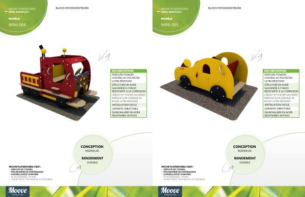MODÈLE BLOCS PSYCHOMOTEURS MOOVE PLAYGROUNDS C ’ EST : • SERVICE DE CONSEIL • PROGRAMME DE PARTENARIAT • SURVEILLANCE CHANTIER NOS INNOVATIONS CÂBLES NYLON ULTRA RÉSISTANT DE D ' UN CORDAGE ENROULÉ D ' ACIER GALVANISÉ FAIT PEINTURE ULTRA RÉSISTANT COATING AU POLYESTER POWDER QUINCAILLERIE ANTIVOL INOXYDABLE EN ACIER • PLAN INGÉNISÉ FOURNI • ASSISTANCE TECHNIQUE ACCESSIBLE MINI-004 MOOVE PLAYGROUNDS MINIPLAY ! SÉRIE STRUCTURE À LA CORROSION RÉSISTANTE À CHAUD GALVANISÉ EN ACIER GARANTIE IMBATTABLE INSTALLATION FACILE CONCEPTION RENDEMENT DURABLE INGÉNIEUSE