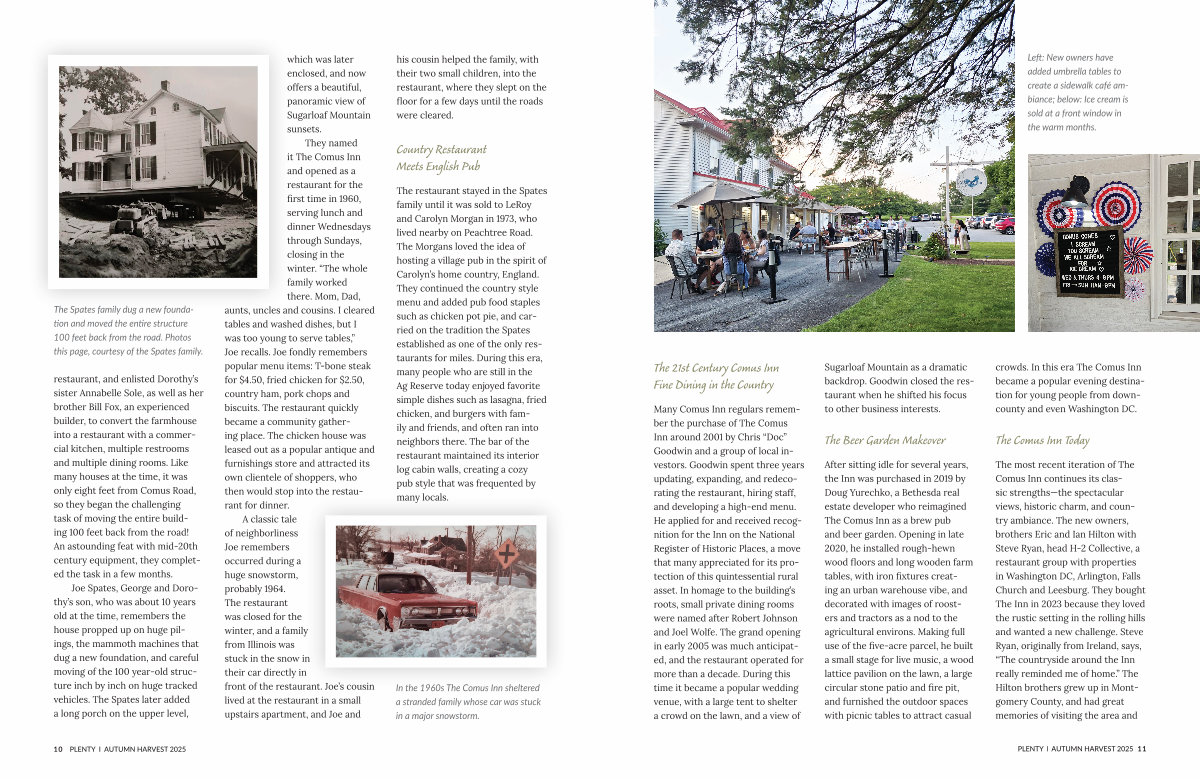 The most recent iteration of The Comus Inn continues its classic strengths— the spectacular views, historic charm, and country ambiance. The new owners, brothers Eric and Ian Hilton with Steve Ryan, head H-2 Collective, a restaurant group with properties in Washington DC, Arlington, Falls Church and Leesburg. They bought The Inn in 2023 because they loved the rustic setting in the rolling hills and wanted a new challenge. Steve Ryan, originally from Ireland, says,“ The countryside around the Inn really reminded me of home.” The Hilton brothers grew up in Montgomery County, and had great memories of visiting the area and
