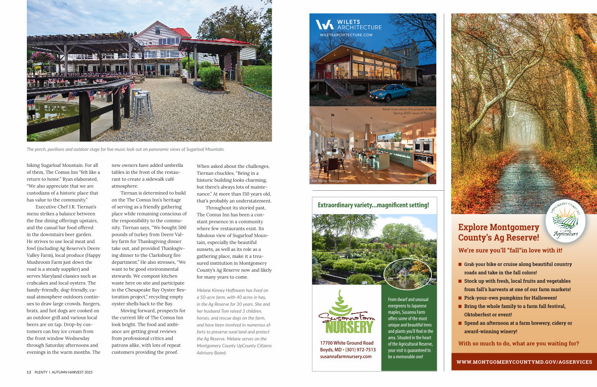 Throughout its storied past, The Comus Inn has been a constant presence in a community where few restaurants exist. Its fabulous view of Sugarloaf Mountain, especially the beautiful sunsets, as well as its role as a gathering place, make it a treasured institution in Montgomery County’ s Ag Reserve now and likely for many years to come.