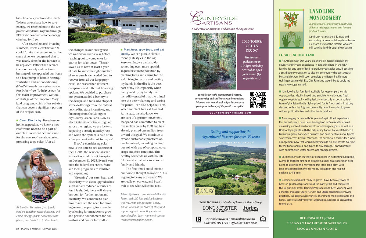 “ Greening” our cars, heat, and electricity with clean upgrades has substantially reduced our uses of fossil fuels. But, there will always be room for further action and creativity. We continue to plan how to reduce the need for mowing on our property, for example, by allowing for meadows to grow and provide nourishment for pollinators and homes for wildlife. n Plant trees, grow food, and eat locally. We can pursue climatefriendly lifestyles in the Ag Reserve. But, we can also do something even more special: sequester climate pollution by planting trees and caring for the soil. Living in nature and putting my hands in the dirt is the best part of my life, especially when I am joined by my family. I am incredibly grateful that the thing I love the best— planting and caring for plants— can also help the Earth. When we plant trees at Bluebird Farmstead, we also know we are part of a greater movement. Maryland has committed to plant five million trees by 2031 and has already planted one million trees toward this goal. We continue to expand sustainable practices on our farmstead, including feeding our soil with use of compost, cover crops and crop rotations. This healthy soil feeds us with bountiful harvests that we can share with family and friends.