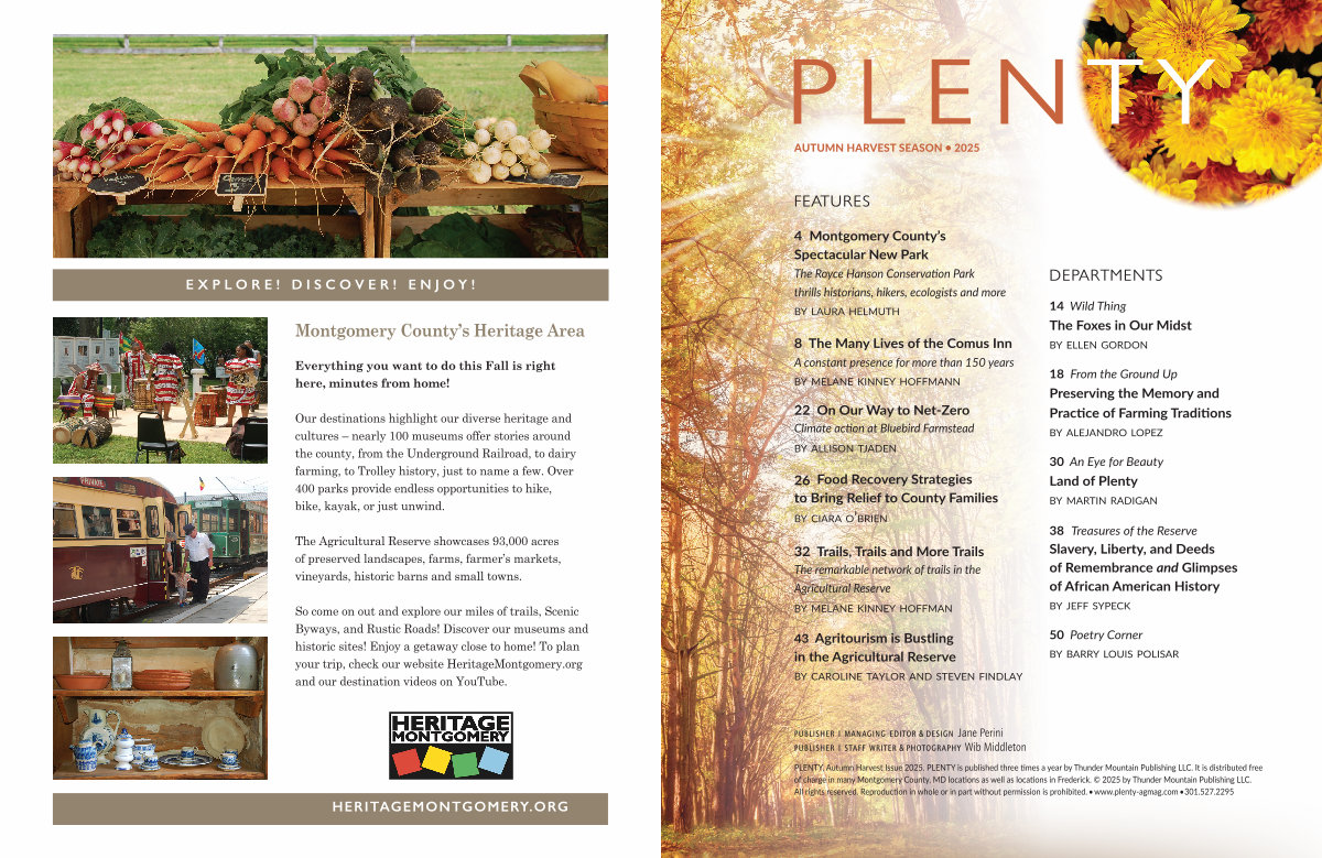 PLENTY, Autumn Harvest Issue 2025. Plenty is published three times a year by Thunder Mountain Publishing LLC. It is distributed free of charge in many Montgomery County, MD locations as well as locations in Frederick. © 2025 by Thunder Mountain Publishing LLC. All rights reserved. Reproduction in whole or in part without permission is prohibited. • www. plenty-agmag. com • 301.527.2295