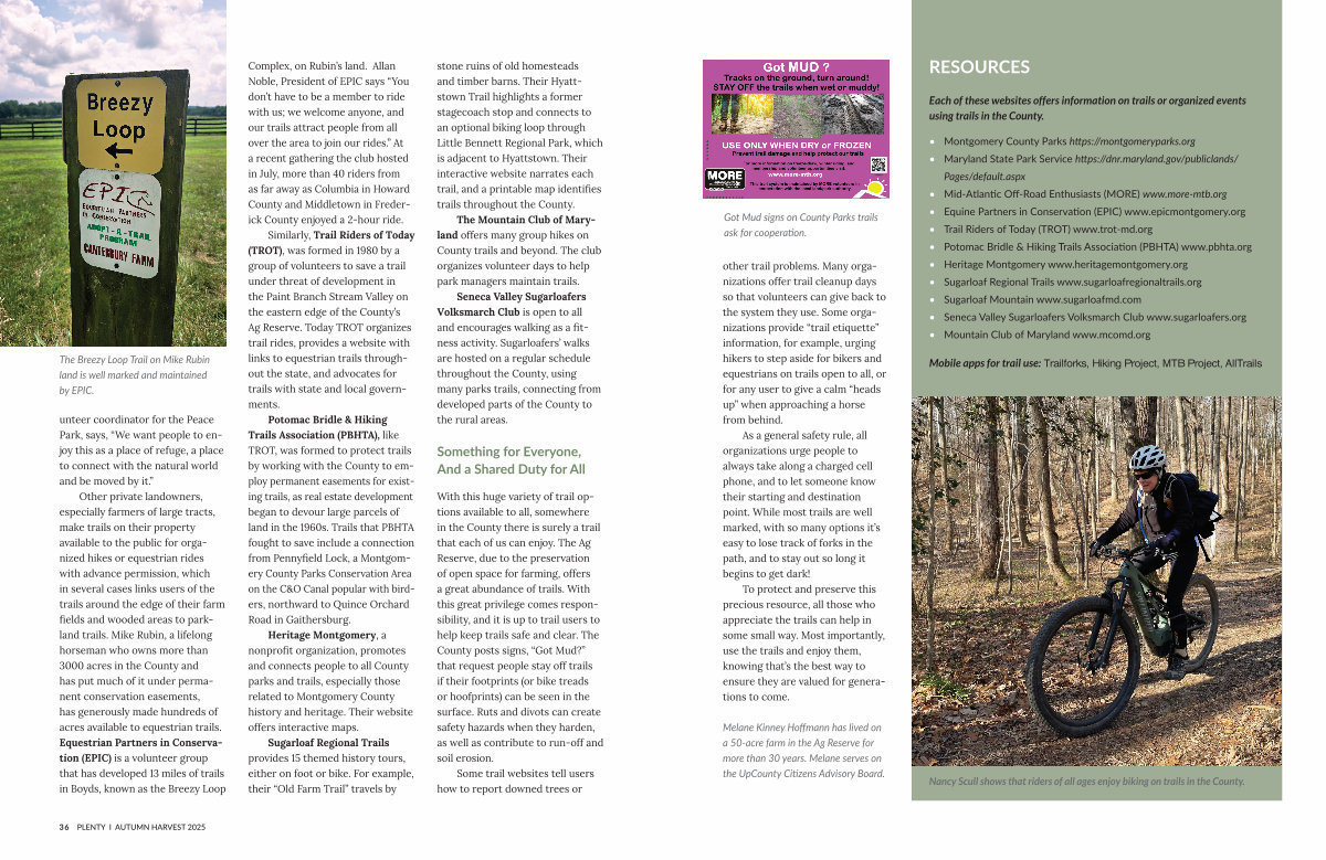 Other private landowners, especially farmers of large tracts, make trails on their property available to the public for organized hikes or equestrian rides with advance permission, which in several cases links users of the trails around the edge of their farm fields and wooded areas to parkland trails. Mike Rubin, a lifelong horseman who owns more than 3000 acres in the County and has put much of it under permanent conservation easements, has generously made hundreds of acres available to equestrian trails. Equestrian Partners in Conservation( EPIC) is a volunteer group that has developed 13 miles of trails in Boyds, known as the Breezy Loop
