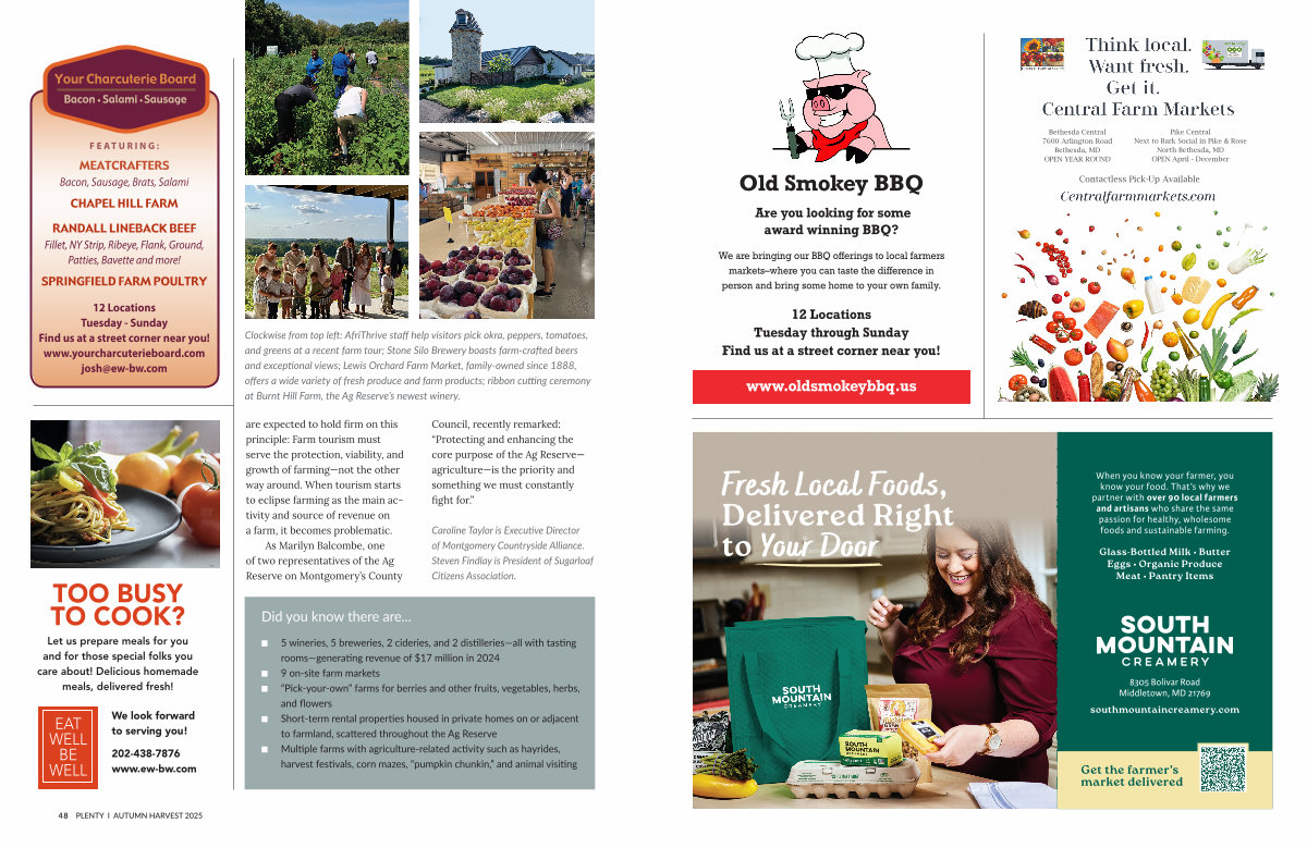 n 5 wineries, 5 breweries, 2 cideries, and 2 distilleries— all with tasting rooms— generating revenue of $ 17 million in 2024 n 9 on-site farm markets n“ Pick-your-own” farms for berries and other fruits, vegetables, herbs, and flowers n Short-term rental properties housed in private homes on or adjacent to farmland, scattered throughout the Ag Reserve n Multiple farms with agriculture-related activity such as hayrides, harvest festivals, corn mazes,“ pumpkin chunkin,” and animal visiting