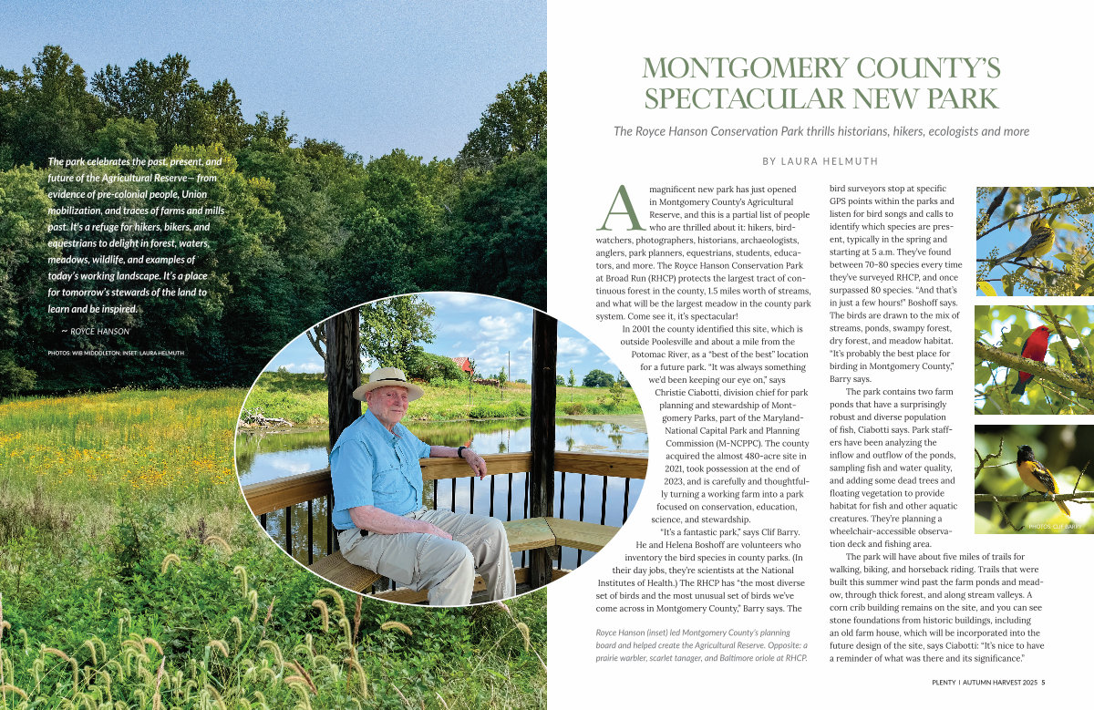 A magnificent new park has just opened in Montgomery County’ s Agricultural Reserve, and this is a partial list of people who are thrilled about it: hikers, birdwatchers, photographers, historians, archaeologists, anglers, park planners, equestrians, students, educators, and more. The Royce Hanson Conservation Park at Broad Run( RHCP) protects the largest tract of continuous forest in the county, 1.5 miles worth of streams, and what will be the largest meadow in the county park system. Come see it, it’ s spectacular! In 2001 the county identified this site, which is outside Poolesville and about a mile from the