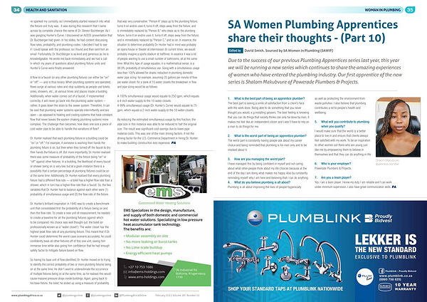 3 . How are you managing the worst part ? I have managed this by being confident in myself and not caring about what other people think about my life choices because at the end of the day I am doing what makes me happy . Also by constantly reminding myself why I am here and believing that I can do anything . 4 . What do you believe plumbing is all about ? Plumbing is all about improving the lives of people hygienically as well as protecting the environment from waste pollution . I also believe that plumbing contributes a lot to people ’ s health and wellbeing .