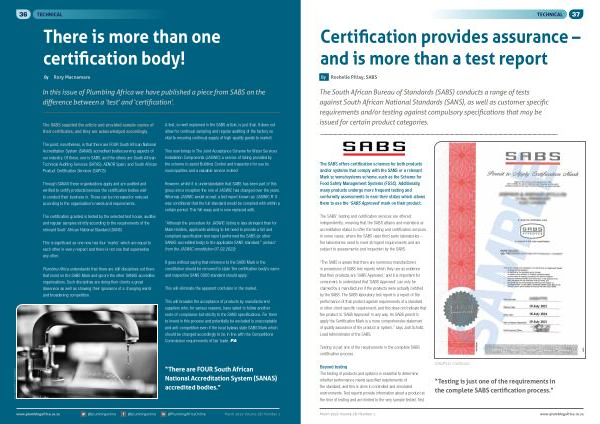 In this issue of Plumbing Africa we have published a piece from SABS on the difference between a ‘ test ’ and ‘ certification ’.