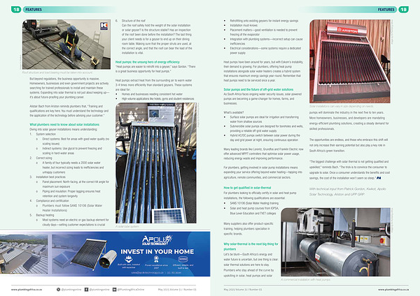 Why solar-thermal is the next big thing for plumbers Let’ s be blunt— South Africa’ s energy and water future is uncertain, but one thing is clear: solar thermal solutions are here to stay. Plumbers who stay ahead of the curve by upskilling in solar, heat pumps and solar