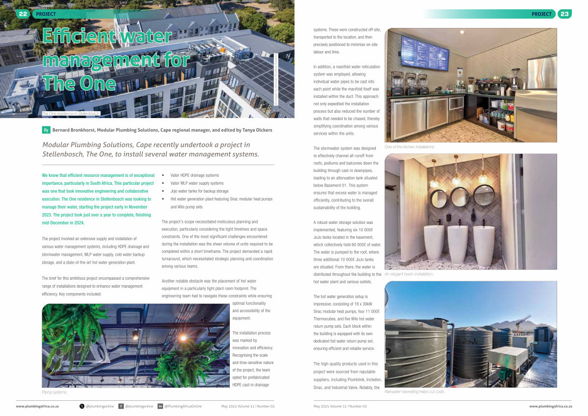 Modular Plumbing Solutions, Cape recently undertook a project in Stellenbosch, The One, to install several water management systems.