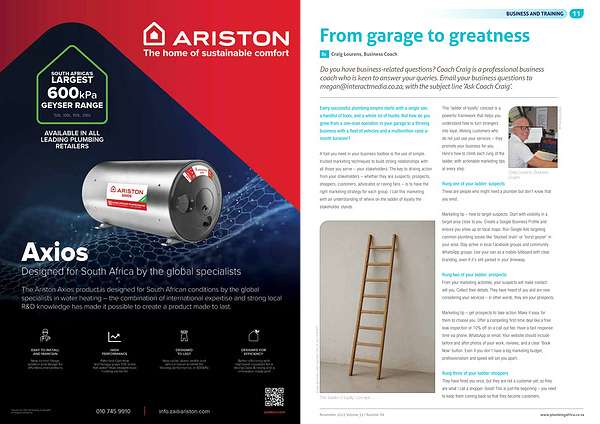 Marketing tip – how to target suspects: Start with visibility in a target area close to you. Create a Google Business Profile and ensure you show up on local maps. Run Google Ads targeting common plumbing issues like ' blocked drain ' or ' burst geyser ' in your area. Stay active in local Facebook groups and community WhatsApp groups. Use your van as a mobile billboard with clear branding, even if it ' s still parked in your driveway.