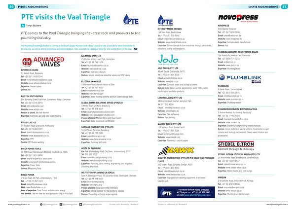 The Plumbing Travelling Exhibition is coming to the Vaal Triangle . Plumbers will have a chance to take a look at the latest innovations in the industry , as well as attend workshops and demonstrations . Take a look at the catalogue below for who will be there on the day .. PA
