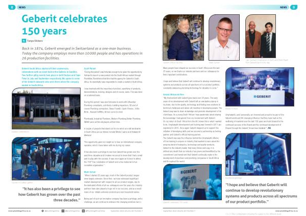 Gerard Ohlson de Fine “ My Involvement with Geberit goes back over 34 years . The early years of my development with Geberit left an everlasting stamp in my brain , due to the quality , technology and finding new solutions to technical challenges and above all investing in developing people . The Geberit way was to share knowledge and promote development of its client base . As a young South African I was passionate about sharing the knowledge I had gained from my involvement with Geberit . On my return to South Africa from the UK I knew this is what I wanted to do . Umphakathi development and training was formed in 2011 and registered in 2015 . Once again Geberit stepped up to support this initiative of developing skills and we secured a partnership as tooling partner and Geberit ’ s official training partner . The Geberit way was the influence behind the Umphakathi offering of free training to anyone in Industry that wanted to learn about the amazing world of hydraulics , technology and quality products . Geberit is the industry leader that many follow and copy . It is without any doubt that our industry has grown and benefitted by the commitment and investment that Geberit continually make in the development of plumbers and plumbing companies in South Africa and throughout the world .