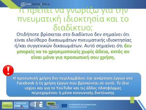 διαδίκτυο ; Οτιδήποτε βρίσκεται στο διαδίκτυο δεν σημαίνει ότι είναι ελεύθερο δικαιωμάτων πνευματικής ιδιοκτησίας ή / και συγγενικών δικαιωμάτων . Αυτό σημαίνει ότι δεν μπορείς να το χρησιμοποιείς χωρίς άδεια , εκτός αν είναι μόνο για προσωπική σου χρήση .