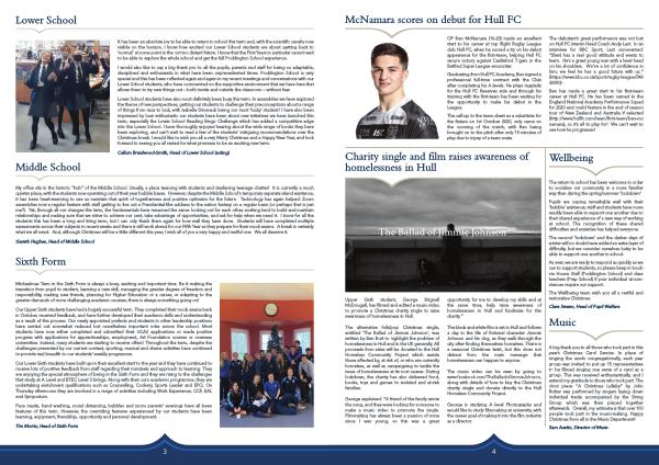 A big thank you to all those who took part in this year ’ s Christmas Carol Service . In place of singing the carols congregationally , each year group was invited to put up 15 representatives to be filmed singing one verse of a carol as a group . This was received enthusiastically , and I extend my gratitude to those who took part . The choir piece “ A Christmas Lullaby ” by John Rutter was performed by singers laying down individual tracks accompanied by the String Group which was then pieced together afterwards . Overall , my estimate is that over 100 people took part in the music-making . Happy Christmas from all in the Music Department !