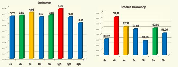 Ĺrednia ocen 4,39 4,50 4,00 3,73 3,81 4,08 3,67 3,83 3,67 3,14 3,50 3,00 2,50 2,00 1,50 1,00 0,50 0,00 7a 7b 7c 8a 8b 3gA 3gB 3gC