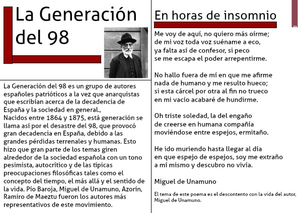 La Generación del 98 es un grupo de autores españoles patrióticos a la vez que anarquistas que escribían acerca de la decadencia de España y la sociedad en general.,