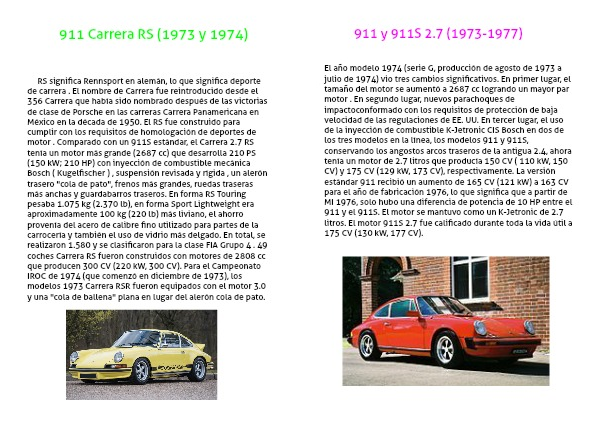 El año modelo 1974 (serie G, producción de agosto de 1973 a julio de 1974) vio tres cambios significativos. En primer lugar, el tamaño del motor se aumentó a 2687 cc logrando un mayor par motor . En segundo lugar, nuevos parachoques de impactoconformado con los requisitos de protección de baja velocidad de las regulaciones de EE. UU. En tercer lugar, el uso de la inyección de combustible K-Jetronic CIS Bosch en dos de los tres modelos en la línea, los modelos 911 y 911S, conservando los angostos arcos traseros de la antigua 2.4, ahora tenía un motor de 2.7 litros que producía 150 CV ( 110 kW, 150 CV) y 175 CV (129 kW, 173 CV), respectivamente. La versión estándar 911 recibió un aumento de 165 CV (121 kW) a 163 CV para el año de fabricación 1976, lo que significa que a partir de MI 1976, solo hubo una diferencia de potencia de 10 HP entre el 911 y el 911S. El motor se mantuvo como un K-Jetronic de 2.7 litros. El motor 911S 2.7 fue calificado durante toda la vida útil a 175 CV (130 kW, 177 CV).