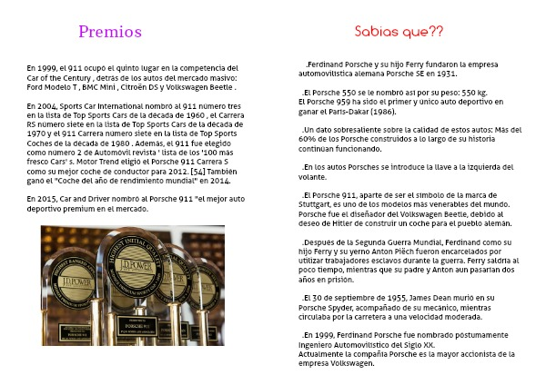 En 2004, Sports Car International nombró al 911 número tres en la lista de Top Sports Cars de la década de 1960 , el Carrera RS número siete en la lista de Top Sports Cars de la década de 1970 y el 911 Carrera número siete en la lista de Top Sports Coches de la década de 1980 . Además, el 911 fue elegido como número 2 de Automóvil revista ' lista de los '100 más fresco Cars' s. Motor Trend eligió el Porsche 911 Carrera S como su mejor coche de conductor para 2012. [54] También ganó el "Coche del año de rendimiento mundial" en 2014.