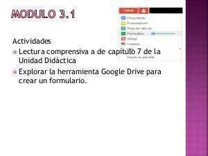 Actividades Lectura comprensiva a de capítulo 7 de la Unidad Didáctica Explorar la herramienta Google Drive para crear un formulario.