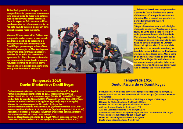 Só que não contava com a substituição dele pelo piloto Max Verstappen o que o jogou de volta para a Toro Rosso, Por tudo que eu ouvi como a influência de Vettel nessa decisão, Da pressão de Jos Verstappen que exigiu a entrada do seu filho na equipe principal de Dietrich Mateschitz (Caso não o fizesse ele iria para a Ferrari no que não acredito), No fatodele tomar 4 décimos de Ricciardo e do cima da Toro Rosso entre Max e Sainz jr. eu afirmo sem sombra de dúvidas de que a Troca é injustificavél e imoral por vários motivos e o primeiro deles esta nesses números Abaixo que comprovam que a antecipação foi um equivoco!