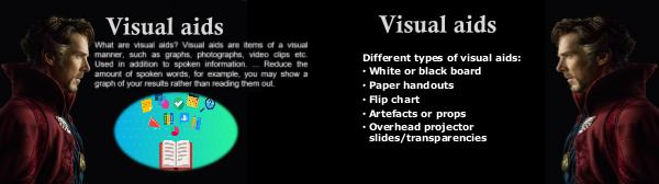 Different types of visual aids: • White or black board • Paper handouts • Flip chart • Artefacts or props • Overhead projector slides/transparencies