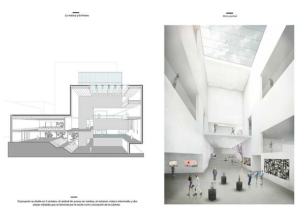 El proyecto se divide en 3 estratos: el umbral de acceso en sombra, el volumen másico intermedio y dos