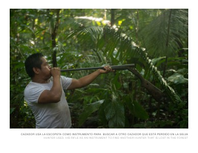CAZADOR USA LA ESCOPETA COMO INSTRUMENTO PARA BUSCAR A OTRO CAZADOR QUE ESTÁ PERDIDO EN LA SELVA