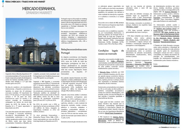 Portugal ocupou a 8ª posição no ranking dos fornecedores de Espanha, represen- tando 3,9% do total importado em 2016, de acordo com o ITC, tendo as compras espanholas a Portugal diminuído 1% face ao ano anterior.