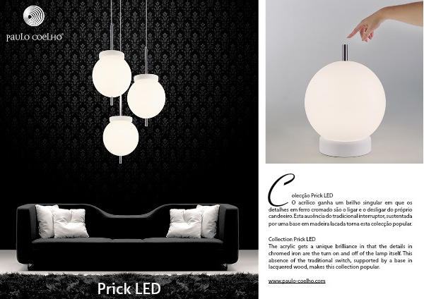 O acrílico ganha um brilho singular em que os detalhes em ferro cromado são o ligar e o desligar do próprio candeeiro. Esta ausência do tradicional interruptor, sustentada por uma base em madeira lacada torna esta colecção popular.