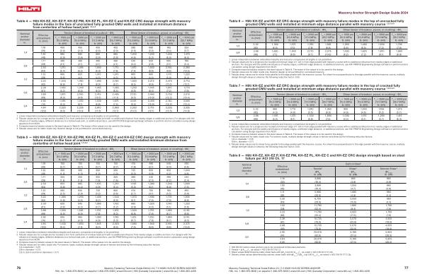 Table 7 — Hilti KH-EZ and KH-EZ CRC design strength with masonry failure modes in the top of cracked fully grouted CMU walls and installed at minimum edge distance parallel with masonry course 1 , 2 , 3 , 4 , 5