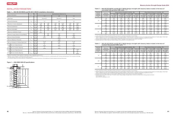 Table 2 — Hilti KH-EZ SS316 and KH-EZ C SS316 design strength with masonry failure modes in the face of uncracked fully grouted CMU walls 1 , 2 , 3 , 4
