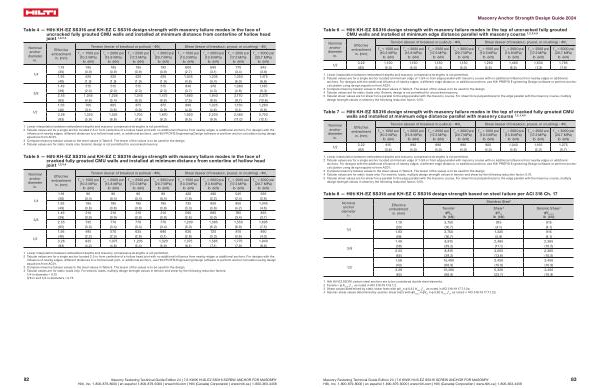 Table 4 — Hilti KH-EZ SS316 and KH-EZ C SS316 design strength with masonry failure modes in the face of uncracked fully grouted CMU walls and installed at minimum distance from centerline of hollow head joint 1 , 2 , 3 , 4