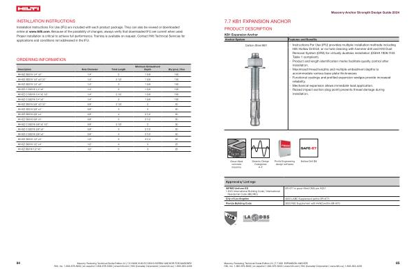 Masonry Fastening Technical Guide Edition 24 | 7.7 KB1 EXPANSION ANCHOR Hilti , Inc . 1-800-879-8000 | en español 1-800-879-5000 | www . hilti . com | Hilti ( Canada ) Corporation | www . hilti . ca | 1-800-363-4458
