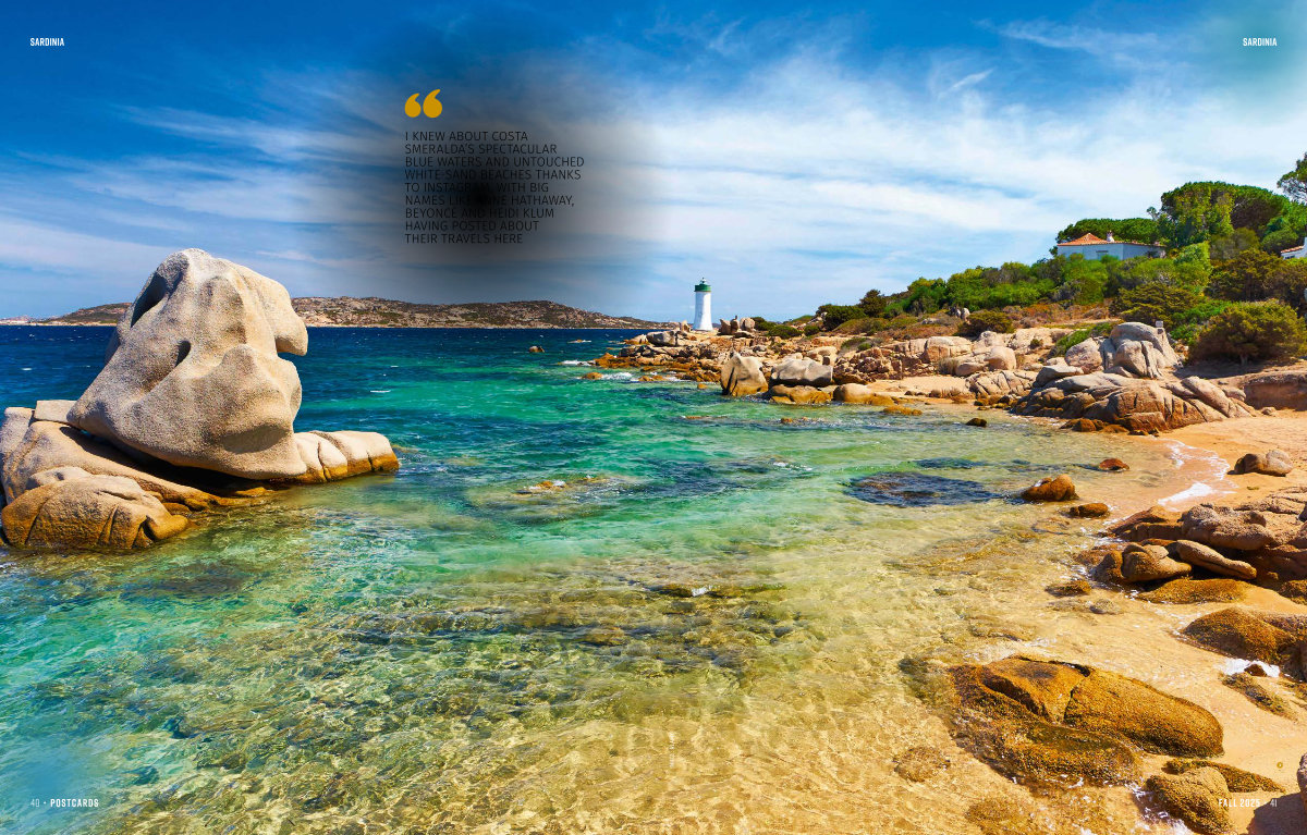 I KNEW ABOUT COSTA SMERALDA’ S SPECTACULAR BLUE WATERS AND UNTOUCHED WHITE-SAND BEACHES THANKS TO INSTAGRAM, WITH BIG NAMES LIKE ANNE HATHAWAY, BEYONCÉ AND HEIDI KLUM HAVING POSTED ABOUT THEIR TRAVELS HERE