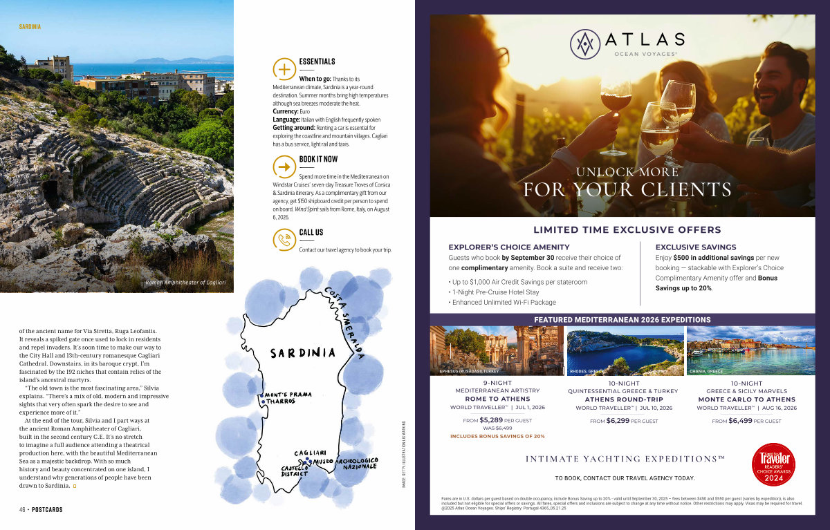Fares are in U. S. dollars per guest based on double occupancy, include Bonus Saving up to 20 %- valid until September 30, 2025 – fees between $ 450 and $ 550 per guest( varies by expedition), is also included but not eligible for special offers or savings. All fares, special offers and inclusions are subject to change at any time without notice. Other restrictions may apply. Visas may be required for travel. @ 2025 Atlas Ocean Voyages. Ships’ Registry: Portugal 4365 _ 05.21.25