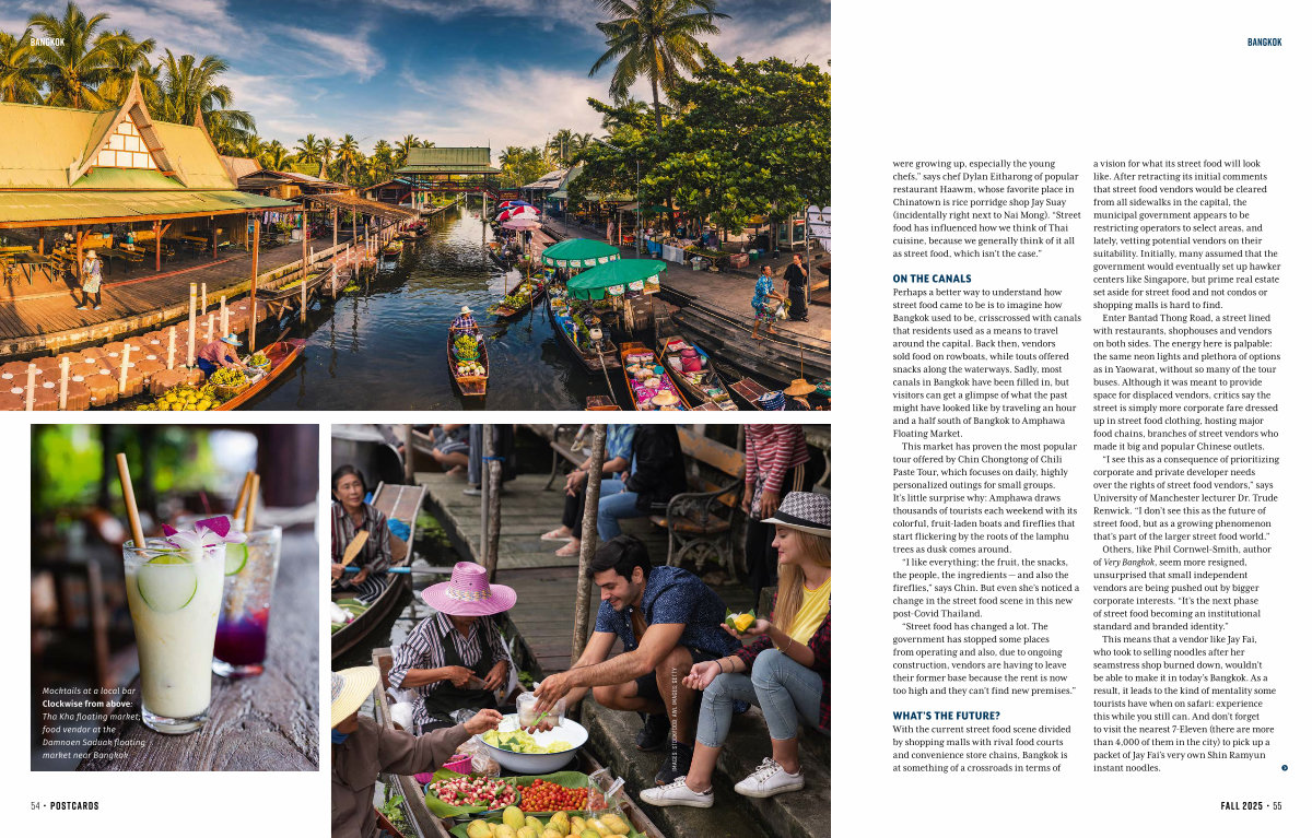 This means that a vendor like Jay Fai, who took to selling noodles after her seamstress shop burned down, wouldn’ t be able to make it in today’ s Bangkok. As a result, it leads to the kind of mentality some tourists have when on safari: experience this while you still can. And don’ t forget to visit the nearest 7-Eleven( there are more than 4,000 of them in the city) to pick up a packet of Jay Fai’ s very own Shin Ramyun instant noodles. fall 2025 • 55