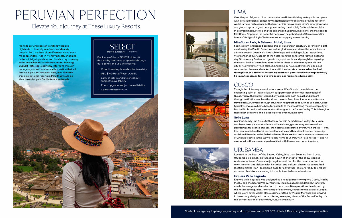 From its curving coastline and snowcapped highlands to its misty rainforests and sandy deserts, Peru is a land of prolific natural and manmade splendors. Add in friendly people, engaging culture, intriguing cuisine and Inca history— along with special benefits and amenities for booking SELECT Hotels & Resorts by Internova through our agency— and you have a destination that will remain in your soul forever. Here, we showcase three exceptional resorts in Peru that would be ideal bases for your South American travels.
