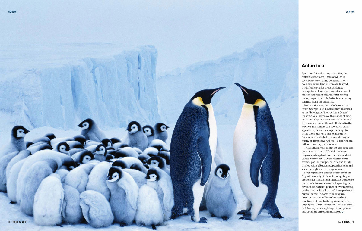 Biodiversity hotspots include subarctic South Georgia Island. Sometimes described as the‘ Serengeti of the Southern Ocean’, it’ s home to hundreds of thousands of king penguins, elephant seals and giant petrels. On the more remote Snow Hill Island in the Weddell Sea, visitors can spot Antarctica’ s signature species, the emperor penguin, while those lucky enough to make it to Cape Adare can behold the world’ s largest colony of diminutive Adélies— a quarter of a million breeding pairs in total.