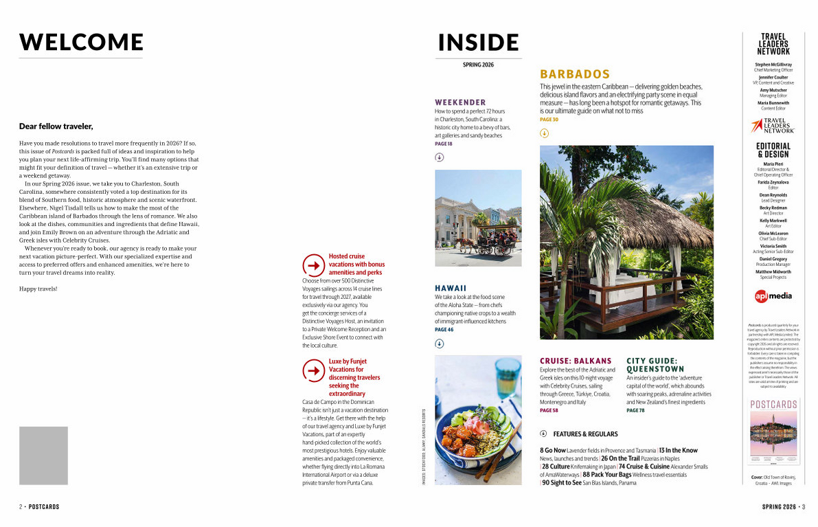 In our Spring 2026 issue, we take you to Charleston, South Carolina, somewhere consistently voted a top destination for its blend of Southern food, historic atmosphere and scenic waterfront. Elsewhere, Nigel Tisdall tells us how to make the most of the Caribbean island of Barbados through the lens of romance. We also look at the dishes, communities and ingredients that define Hawaii, and join Emily Brown on an adventure through the Adriatic and Greek isles with Celebrity Cruises.