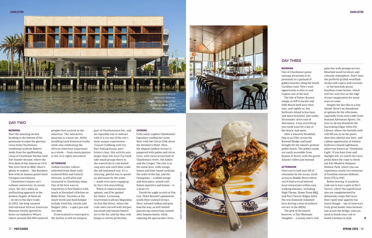 Before leaving, it would be rude not to have a pint at Poe’ s Tavern, where the superb local ales are complemented by deliciously crispy fish tacos. Don’ t spoil your appetite too much though— one of America’ s truly great foodie cities beckons just across the bridge, and you need to finish your visit to South Carolina in style.