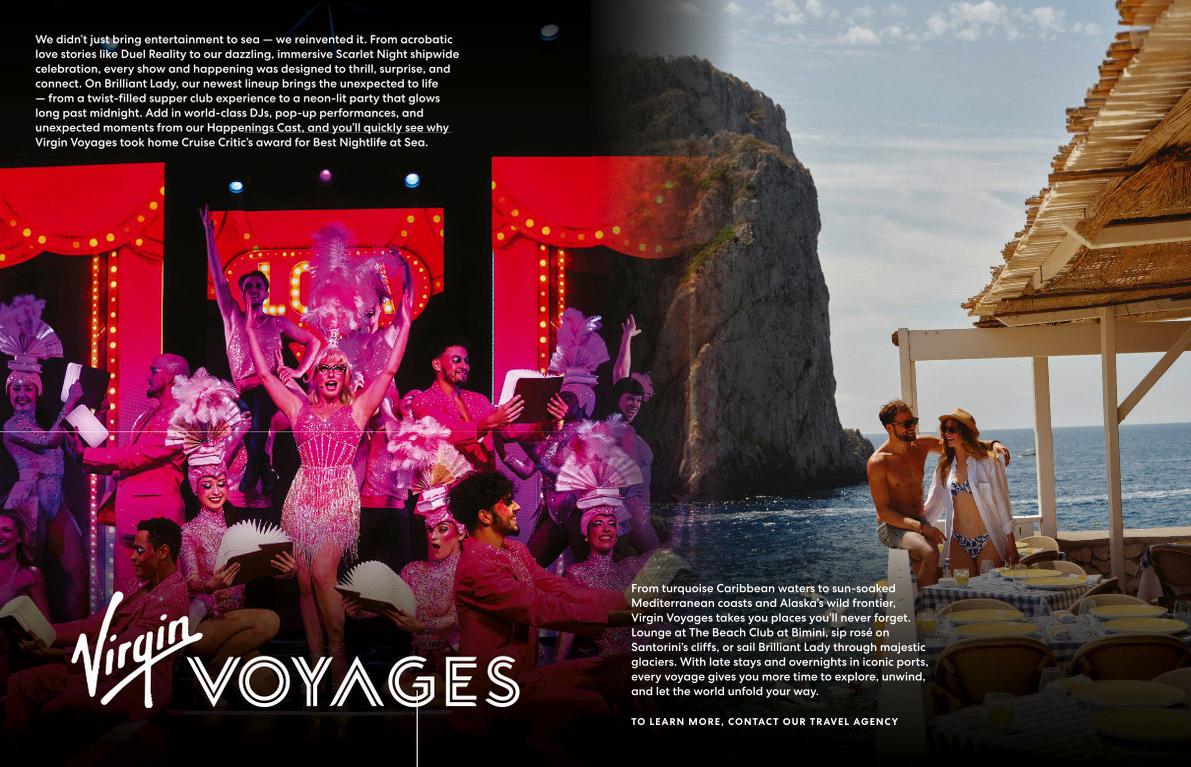 We didn’ t just bring entertainment to sea— we reinvented it. From acrobatic love stories like Duel Reality to our dazzling, immersive Scarlet Night shipwide celebration, every show and happening was designed to thrill, surprise, and connect. On Brilliant Lady, our newest lineup brings the unexpected to life— from a twist-filled supper club experience to a neon-lit party that glows long past midnight. Add in world-class DJs, pop-up performances, and unexpected moments from our Happenings Cast, and you’ ll quickly see why Virgin Voyages took home Cruise Critic’ s award for Best Nightlife at Sea.