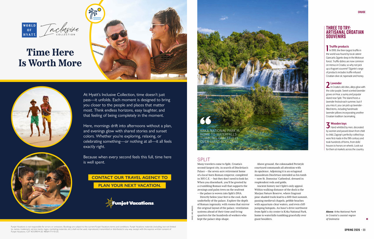 Ancient history isn’ t Split’ s only appeal. Within walking distance of the dock is the Marjan Nature Reserve, where fragrant pine-shaded trails lead to a 600-foot summit, passing medieval chapels, pebble beaches with aquarium-clear waters, and even cliffjumping hotspots. An hour’ s drive northwest from Split’ s city center is Krka National Park, home to waterfalls tumbling gracefully over giant boulders.